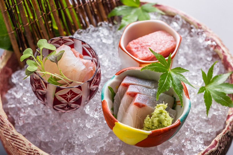 籠に入った色とりどりの小付け盛りや、新鮮野菜の蒸篭蒸しなど、